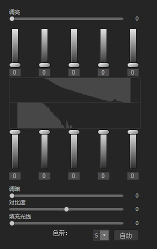 - 标准选项卡:使用每个色带的滑块独立调整图像中不同色带(相对明亮或暗淡的区域)的亮度与对比度。有一个图形显示应用于整个色调范围的调亮或调暗量。图形中的灰色区域是建议的调整边界,以免剪切和丢失细节,变红表示滑块已经调整得多到足以剪切掉一些细节。