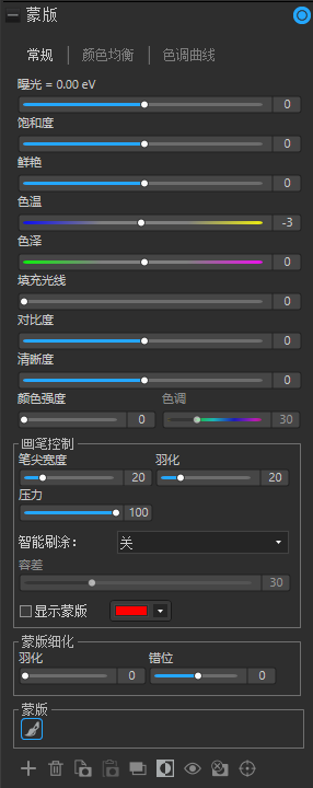 1. 在“冲印工具”窗格的“微调”或“详细”选项卡中,单击“蒙版”,然后单击“画笔”,打开控制面板,进入 刷子 蒙版模式。