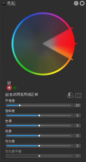 在冲印工具窗格和编辑器中,可使用色轮调整图像中的精确颜色。色轮可更改精确颜色的饱和度、色调、亮度、对比度和对比度平衡。色轮还调整平滑度,其作用类似于使用羽化工具柔化颜色的边缘。色轮特别适用于一般的要求,例如使碧空更蓝,或者使幽暗的水变亮,以呈现波光粼粼的湖泊。