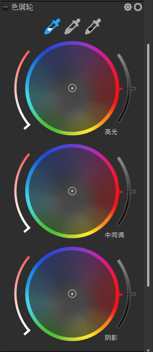 每个图像中的颜色都分为高光、中间调和阴影。使用“冲印工具”中的色调轮,可向图像中的某些色调添加色彩。每个色调轮都有两个弯曲滑块。左侧的弯曲滑块是饱和度滑块,右侧的滑块是亮度滑块。色调轮本身允许精确调整色相。
