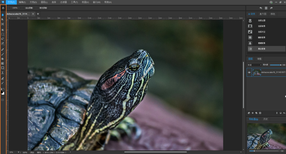 显示区域占据编辑器中央的大部分空间,是显示图像的地方。显示区域中的图像将在外观上发生变化,以反映通过 宝图编辑 滤镜和工具进行的编辑。